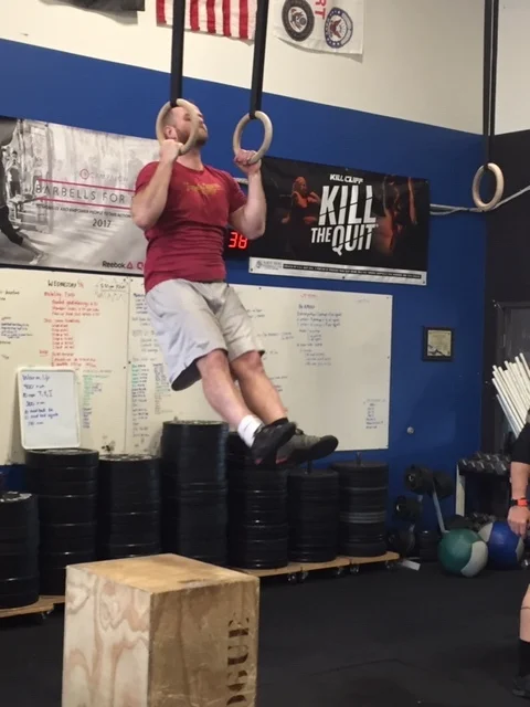 DB thrusters 50/35 35/20 7-4-3 Bar muscles up/ progression used today/ C2B pull ups