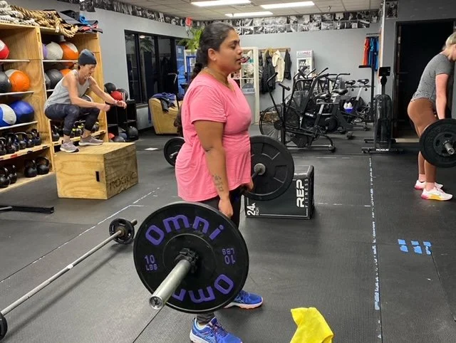 15 reps with a light barbell or PVC and 2.5 or 5# plates